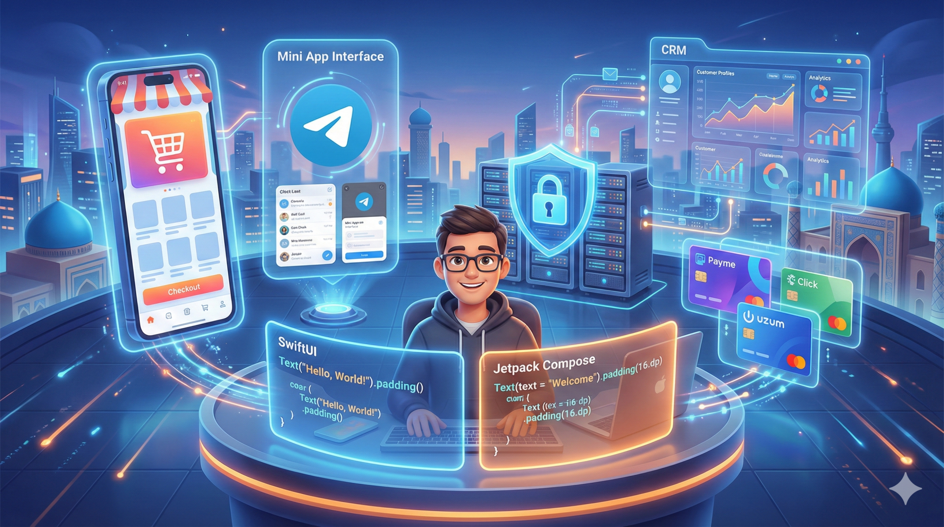 ✅ Internet-do‘konlar: Katalogdan tortib to‘lov tizimlarigacha. Tez, qulay va katta yuklamalarga bardoshli. ✅ Nativ mobil ilovalar: SwiftUI (iOS) va Jetpack Compose (Android) texnologiyalarida ilovalar yaratish. Bu ilovaning qotmasdan ishlashini va foydalanuvchilar uchun qulay dizaynni kafolatlaydi. ✅ Telegram ekotizimi: Murakkab Telegram botlar, Web Apps va Telegram Mini Apps (messenjer ichidagi zamonaviy ilovalar). ✅ Avtomatlashtirish (CRM/ERP): Tovarlar, mijozlar va moliyaviy hisobotlarni yuritish uchun maxsus tizimlar. ✅ Integratsiyalar: To‘lov tizimlari (Payme, Click, Uzum), API va ma’lumotlar parserlari. ✅ DevOps: Loyihangiz 24/7 barqaror ishlashi uchun serverlarni sozlash.