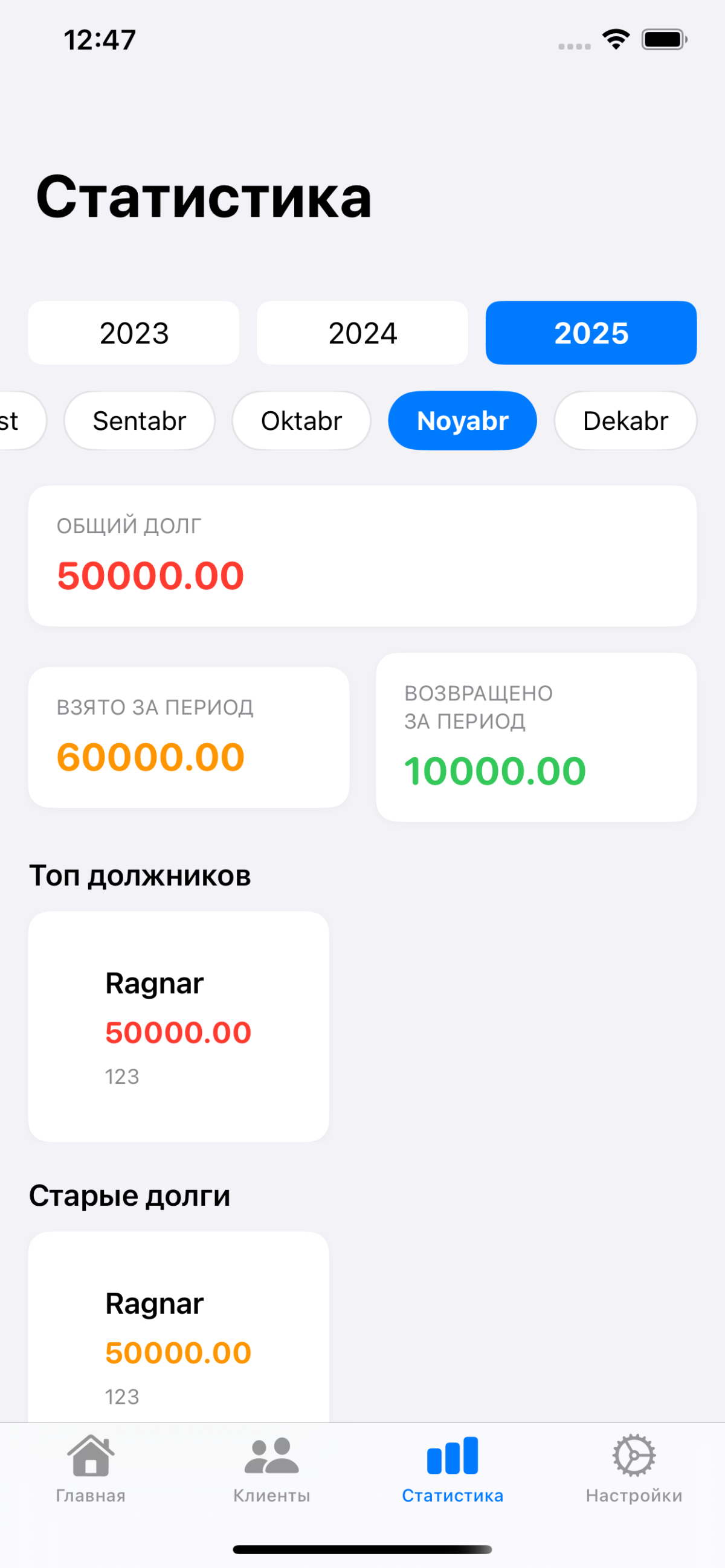 Statistika: Kunlik, oylik va umumiy savdo/qarz holati bo‘yicha aniq grafiklar va raqamlar.